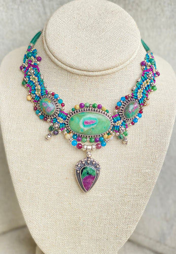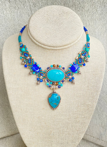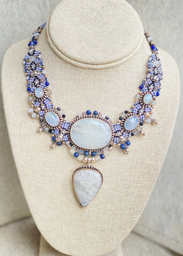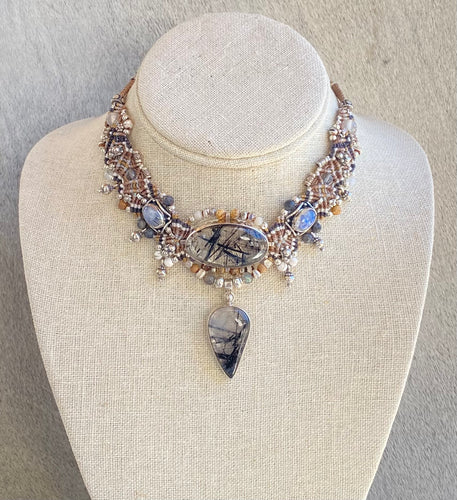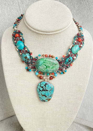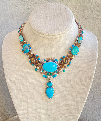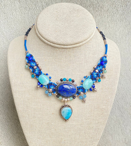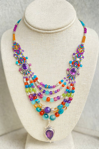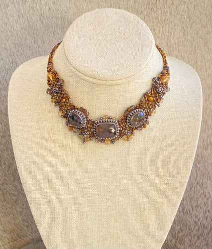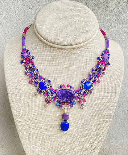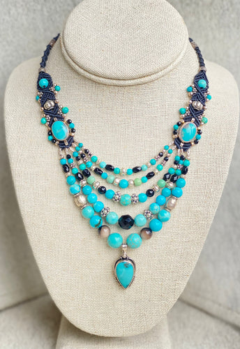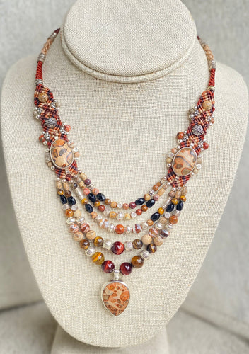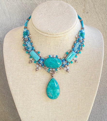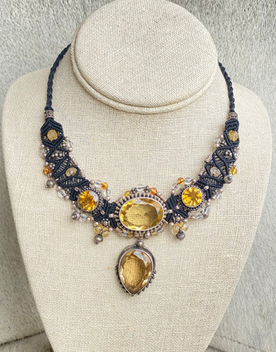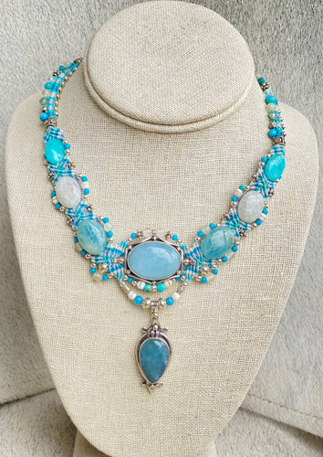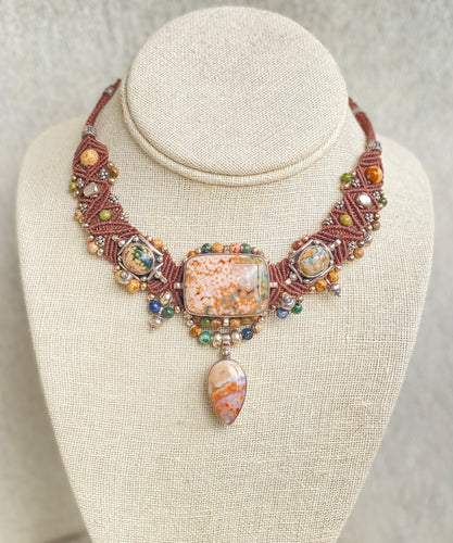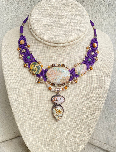 Hand crafted macramé jewelry featuring natural stones and sterling silver details.